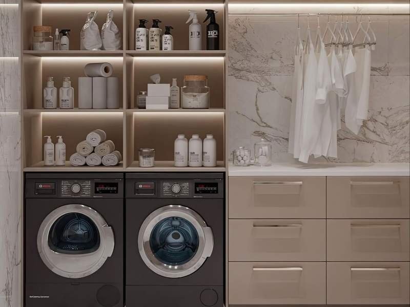 - Since laundry areas often deal with moisture, pick materials that are built to last in humid conditions and are easy to clean and maintain.